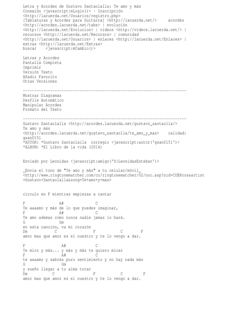 Te amo y más de lo que puedes imaginar Te amo además como nunca nadie jamás lo hará En esta canción va mi corazón Amor más que amor es el nuestro y te lo vengo a dar. Te miro y más y más y mas te quiero mirar Te amo y sabrás puro sentimiento y no hay nada mas Y sueño llegar a tu alma tocar Amor más que amor es el nuestro y te lo. Las aventuras de Manny Rivera MAD y producida por Guillermo del Toro. Te miro y más y más y más te quiero mirar Te amo y sabrás puro sentimiento y no hay nada más Y sueño llegar a tu alma tocar Amor más que amor es el nuestro y te lo vengo a dar. Te Amo y Mas - El Libro de la Vidapdf - Google Drive. La considero una obra maestra de la literatura. Te amo y másel libro de la vida.