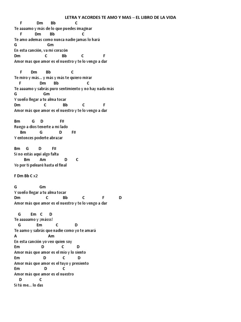 Los números se acabarían los libros no abastecerían Y si hubiera suficientes días para decir tus maravillas La eternidad no alcanzaría. El Libro De La Vida Te Amo Y Mas Lyrics. F Bb C G Dm Bm D Gb Am Em A Chords for Libro de La Vida - Te Amo y mas Letra with song key BPM capo transposer play along with guitar piano ukulele mandolin.