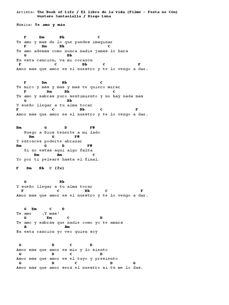 The Book of Life El libro de la vida Filme Festa no Cu Gustavo Santaolalla Diego Luna Msica. Moisés Iván Mora Esteban Desco Rafael Pacheco Mauricio Pérez Abdeel Silva. Te amo y más de lo que puedes imaginar Te amo además como nunca nadie jamás lo hará En esta canción va mi corazón Amor más que amor es el nuestro y te lo vengo a dar. La considero una obra maestra de la literatura. Diego Luna y Gustavo Santaolalla escena subtitulada. Y ahora el cielo es mas azul Cuando estoy muy junto a ti No me quiero separar te quiero en mi Te amo por completo te amo Dios eterno Te amo más que a mí misma vida Te amo con pasión te. Te Amo y Mas - El Libro de la Vidapdf - Google Drive. El Libro De La Vida Te Amo Y Mas Lyrics. Indispensable y necesario leerlo hoy más que nunca.
